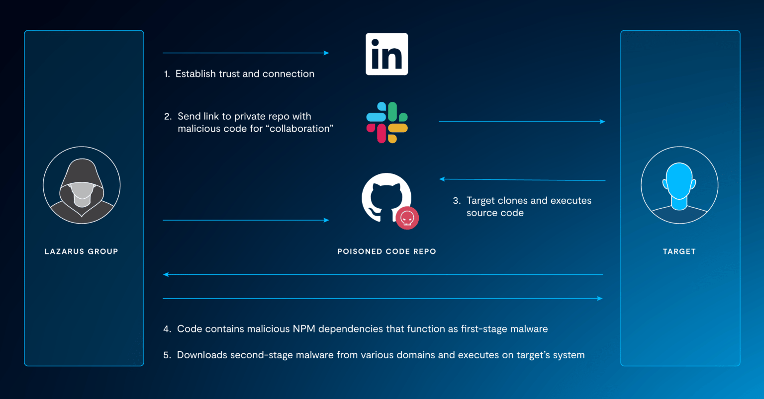 Les chercheurs de Panther ont identifié des attaques visant les développeurs de repo Github. Les répertoires sont utilisés dans des projets liés aux cryptomonnaies. L’attaque a été attribué à Lazarus Group qui appartient à la Corée du Nord. Le fonctionnement est similaire à l’attaque xyz en essayant de gagner la confiance du développeur pour prendre le contrôle sur le repo.