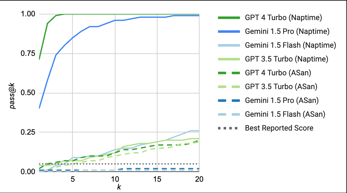 Jusqu’à présent les résultats ne dépassaient pas les 25% de réussite. Avec le framework Naptime (nom du projet des équipes de Google), le score arrive à 100% de réussite avec un peu d’entrainement sur l’IA.